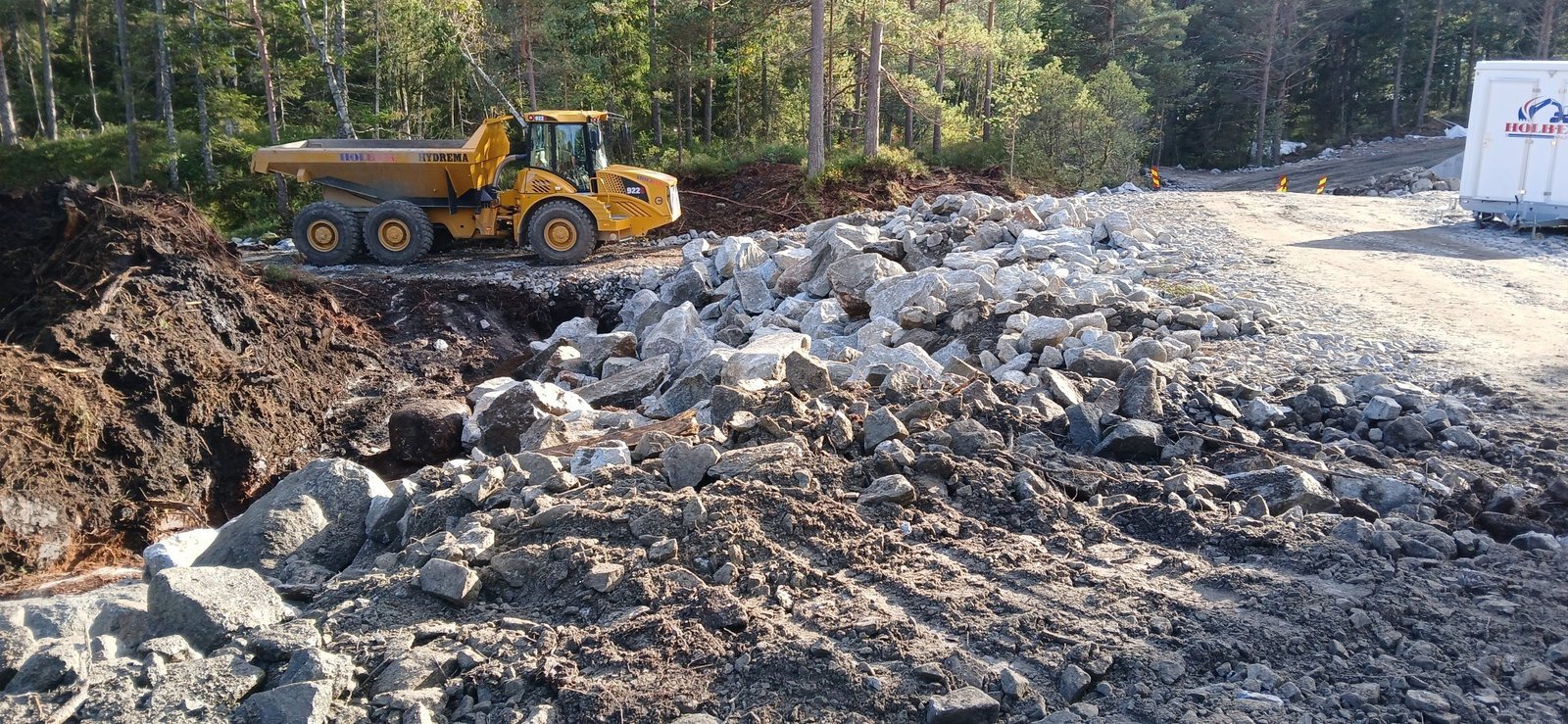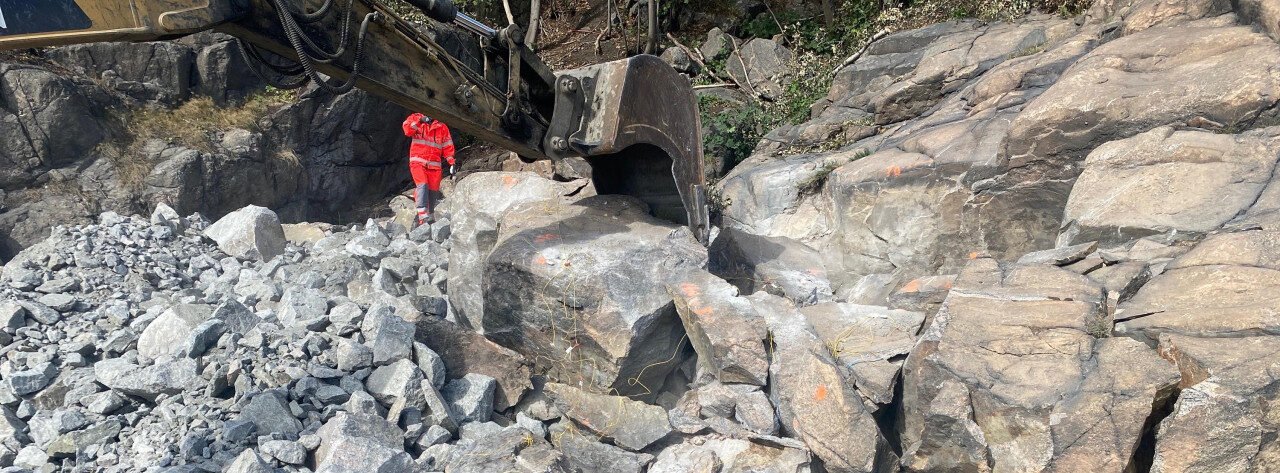 Sprenging av del av Duekniben, ca 35.000 m3, og transport og levering av massene til tilstøtende mellomlager / deponi.